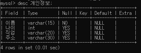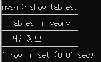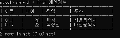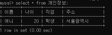 이렇게 입력하시면 현재 개인정보라는 테이블에 들어있는 모든 데이터들을 확인 할 수 있어요.