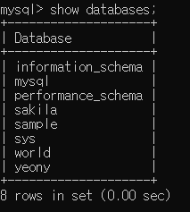 이런식으로 yeony라는 이름의 데이터베이스가 생성된 것을 확인할 수 있어요!