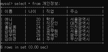 이렇게 개인정보 테이블 안에는 6명의 개인정보가 저장되어 있는 것을 확인할 수 있습니다!!