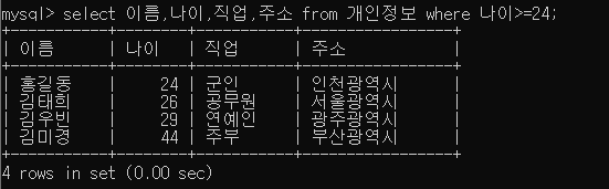 select 이름,나이,직업,주소 from 개인정보 where 나이>=24;
