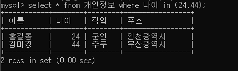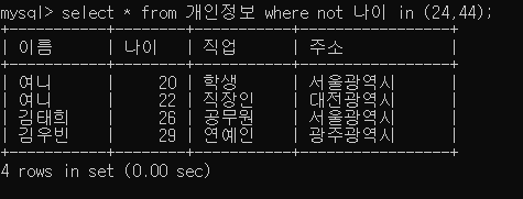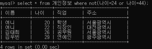 select * from 개인정보 where not 나이=24 and 나이=44;