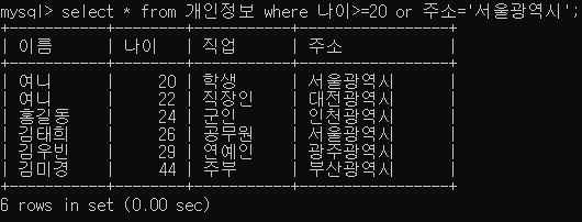 select * from 개인정보 where 나이>=20 or 주소='서울광역시';