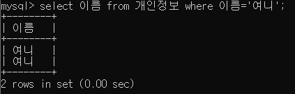 이렇게 입력을 하면 이름이 여니인 사람의 이름 데이터만을 검색하게 되는 거죠!