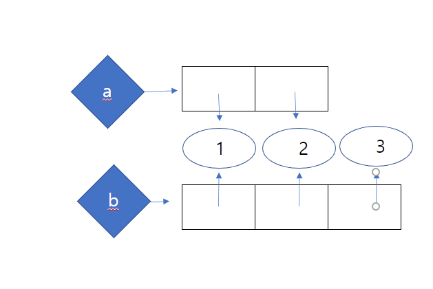 >> a가 참조하고 있는 객체 자체를 복사하고 b가 그 객체를 가리킨다. (얕은 복사)