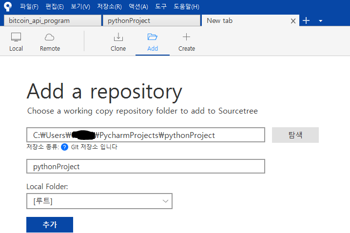 2. Add a repository에서 탐색 버튼을 눌러서 프로젝트 경로 찾기
