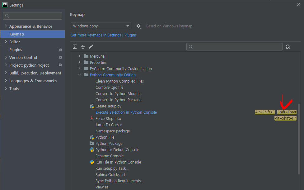 Settings-> Keymap -> Plug-> Python Community Edition -> Execute Selection in Python Console