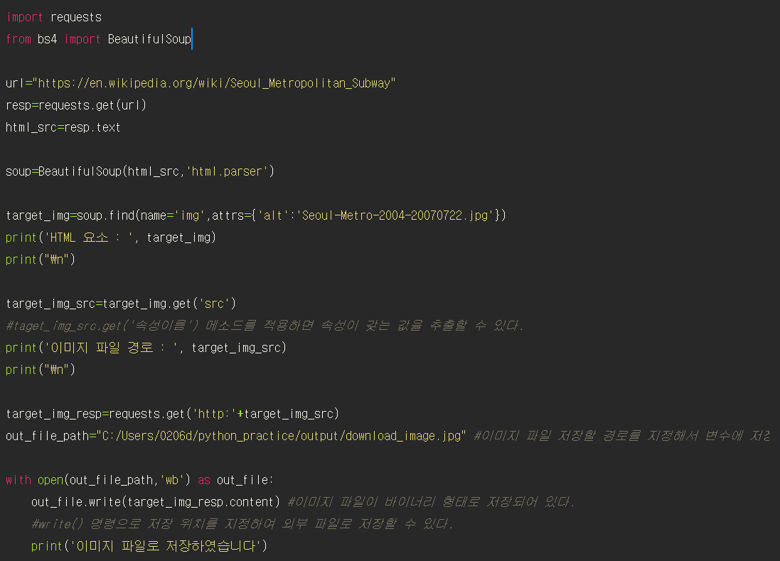 - HTML요소 부분만을 따로 추출하려면 파이썬 리스트의 원소 인덱싱을 사용한다. Subway_image[0]