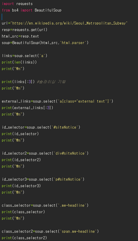 - select()메서드는 find_all()과 비슷하다. 찾으려는 태그 이름을 매개변수로 넘겨주면 웹 문서에서 해당하는 모든 태그를 찾아서 리스트 형태로 반환해준다.