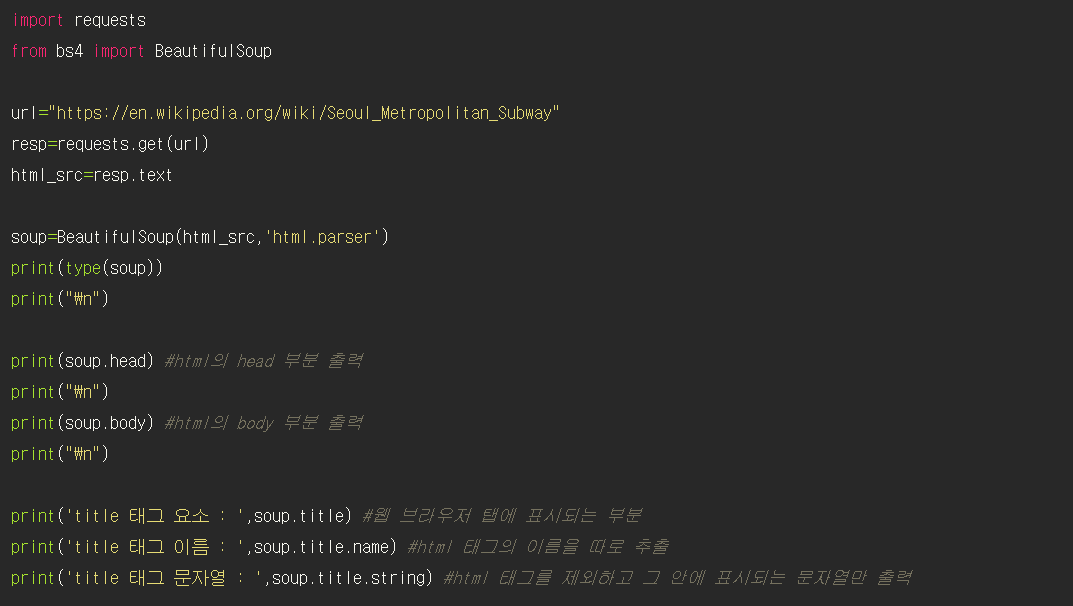 print(type(soup)) => <class 'bs4.BeautifulSoup'>, 즉 bs4 라이브러리에서 불러온 BeautifulSoup 클래스라는 것을 확일할 수 있다.