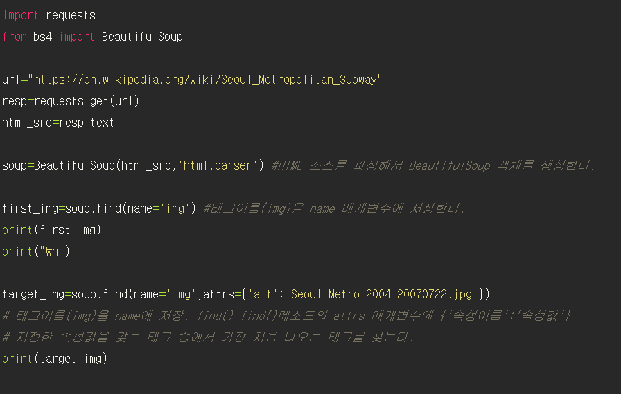 BeautifulSoup 클래스의 find() 메소드는 HTML 문서에서 가장 처음으로 만나는 태그를 한 개 찾는다.