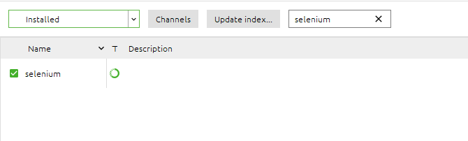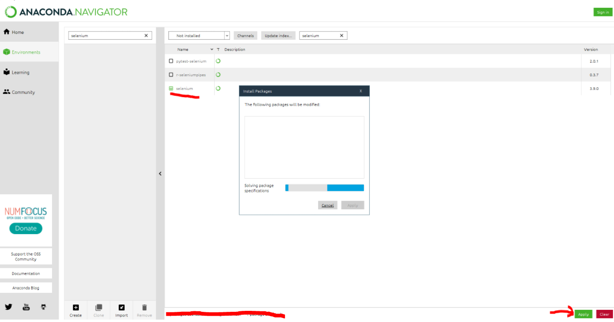 아나콘다 네비게이션 -> Environments -> 가상 서버 체크 -> selenium 검색(not installed 체크)