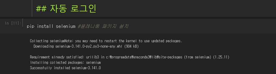 쥬피터 노트북에서 pip install selenium 셀레니움 패키지 설치
