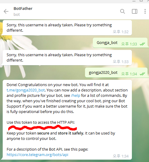 그리고 봇을 생성해주고, 봇의 사용자 이름도 지정해준다.