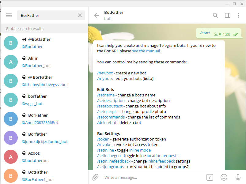텔레그램 검색창에 BorFather을 검색하고 시작 버튼을 누르면 BorFather를 다루는 기본 명령 리스트를 보여줍니다.