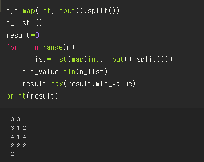 result와 좀 전에 찾아낸 가장 작은 수 중에 큰 숫자를 result 변수에 다시 저장