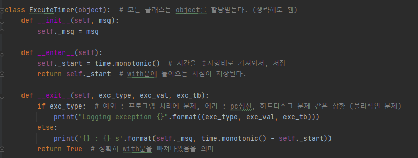 >> python의 file 객체는 __enter__와 __exit__ 함수가 구현되어 있다.