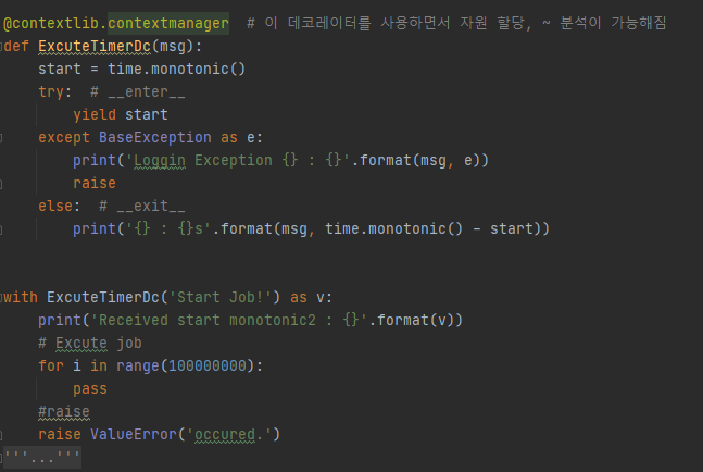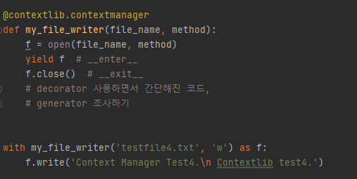 > 이 함수는 클래스나 별도의 __enter__()와 __exit__() 메서드 작성이 필요 없이,