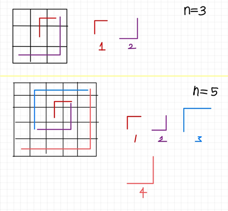 array[n//2][n//2]=1 # 1 위치 잡아주기