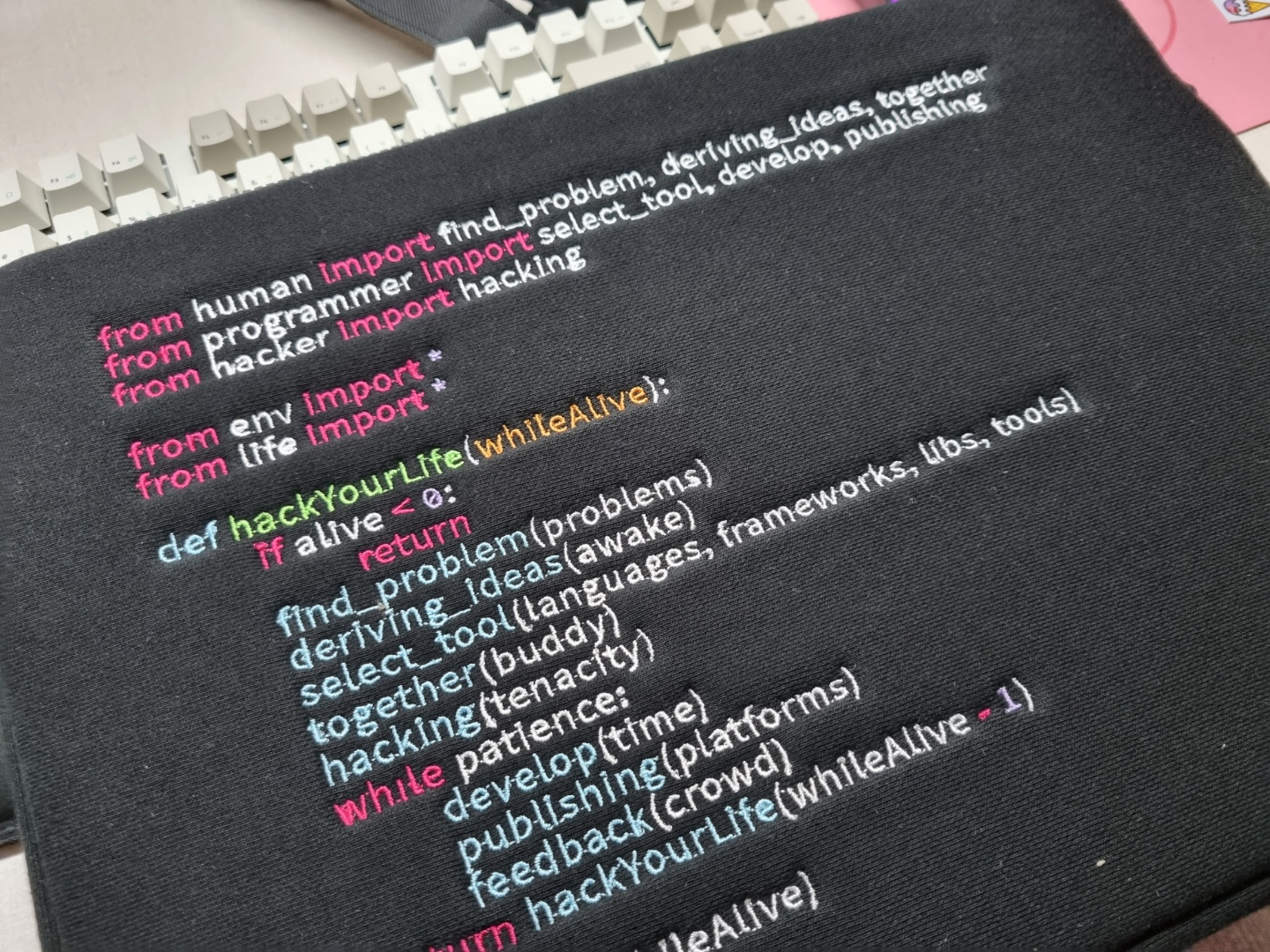 파우치 앞면쪽에는 파이썬 코드가 자수로 새겨져있어요!