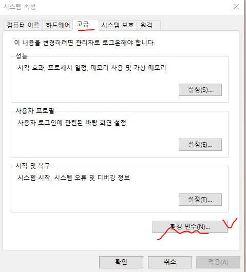고급 시스템 설정 > 고급탭으로 들어간다.