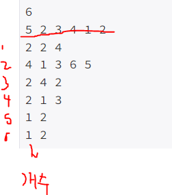 1 2 3 4 5 6 7 8 | 6 5 2 3 4 1 2 2 2 4 -> 1번과 연결되어있는 정점(2,4) 4 1 3 6 5 -> 2번과 연결되어 있는 정점(1,3,6,5) 2 4 2 -> 3번과 연결되어 있는 정점 (2,4) 2 1 3 -> 4번과 연결되어 있는 정점 (1,3) 1 2 -> 5번과 연결되어 있는 정점 (2) 1 2 -> 6번과 연결되어 있는 정점 (2) | cs |