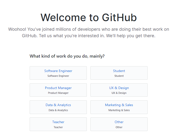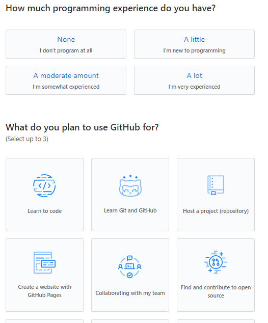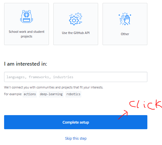 프로그래밍 경력이 얼마나 되는지, 깃허브를 사용하고자 하는 목적이 무엇인지 등등에 대해서 작성을 하고 Complete setup을 클릭하면 회원가입이 완료됩니다!