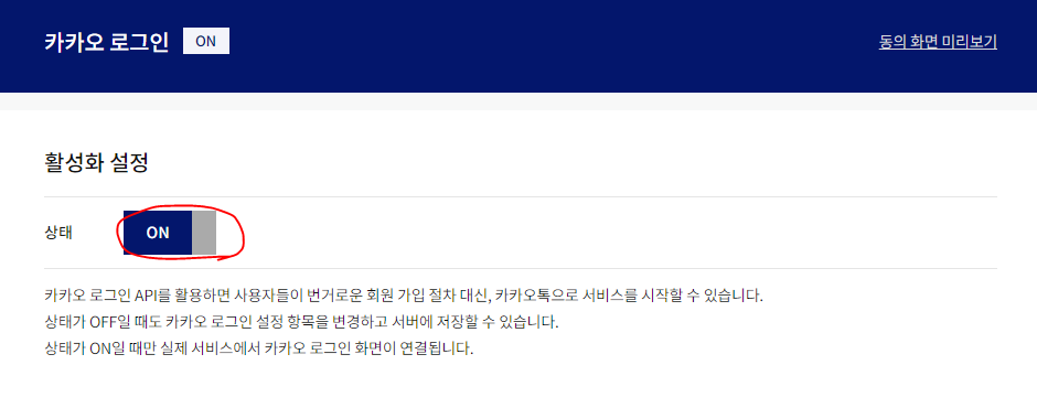 5. 카카오 로그인 카테고리 클릭 후 활성화 설정 ON으로 변경
