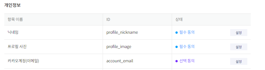 -> 닉네임, 프로필사진, 카카오 계정 모두 동일하게 동의목적 (가입)으로 작성하면 됨.